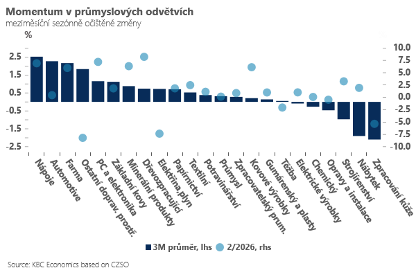 Na druhou stranu příjemnou zprávou z únorových (před-íránských) průmyslových čísel je růst produkce napříč odvětvími. Po sezónním očištění pozitivní momentum v posledních měsících hlásí nejenom skoro tradičně automotive, ale i některé energeticky náročné sektory - včetně producentů základních kovů nebo nekovových minerálních produktů (například skláři). U energeticky náročných odvětví je však oživení velmi křehké (a stále z historicky velmi nízkých úrovní). Navíc naše sektorové analýzy ukazují, že právě tato část průmyslu je opět velmi zranitelná vůči jakémukoliv novému energetickému šoku - ukazatele ziskovosti a zadluženosti jsou v energeticky náročných odvětvích v průměru horší než před ruskou invazí na Ukrajinu. A spokojenost stále nemůže panovat také s produkcí ve strojírenství, kde již druhý rok v řadě vyčkáváme na výraznější restart odvětví. Nové objednávky sice vypadají slibně, ale i zde konflikt na blízkém východě opět může situaci komplikovat.
