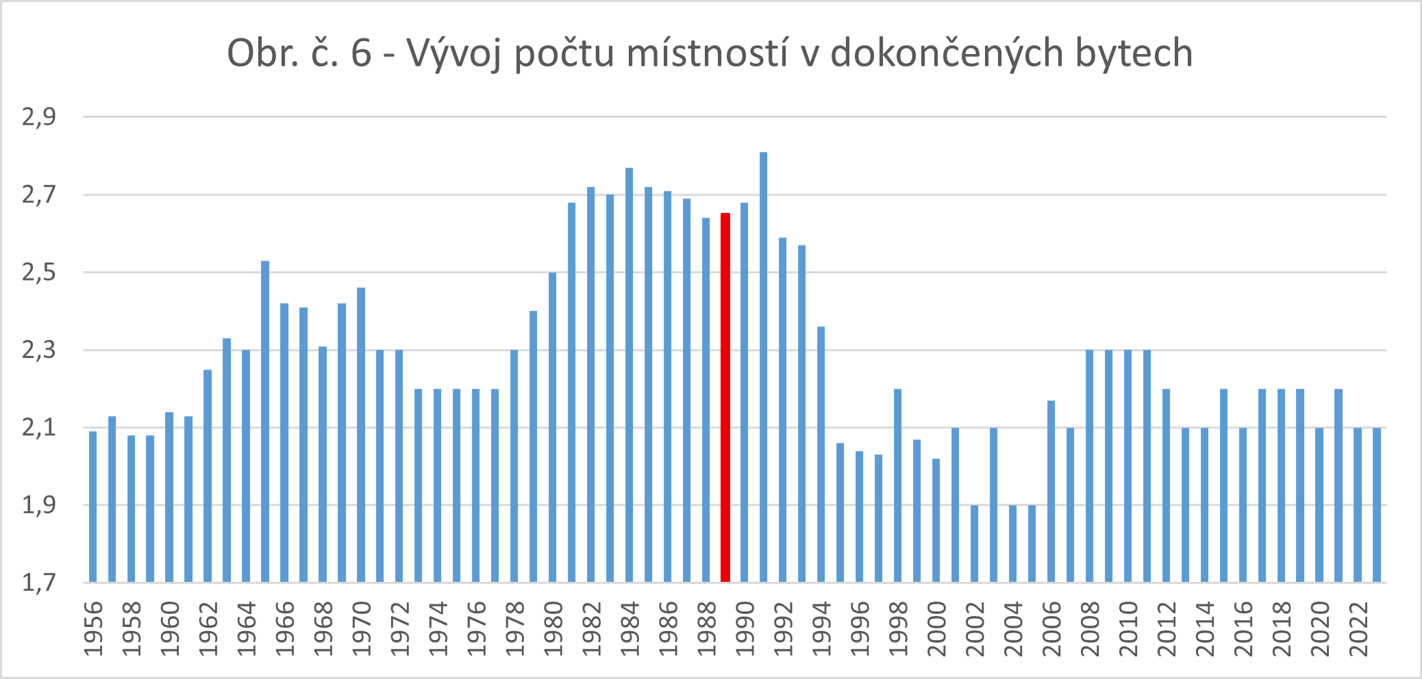 Oponent výše uvedených grafů, které ukazují pokles výstavby bytů po roce 1990, může namítat, že se od tohoto data naopak zlepšila kvalita bydlení. Tvrdit může, že se přestaly stavět malé byty a začaly se stavět byty větší. Podívejme se tedy na to, jak se vyvíjel počet místností v bytech a jejich velikost. Musíme však vzít v úvahu změnu v metodice, konkrétně započítávání kuchyní mezi místnosti.