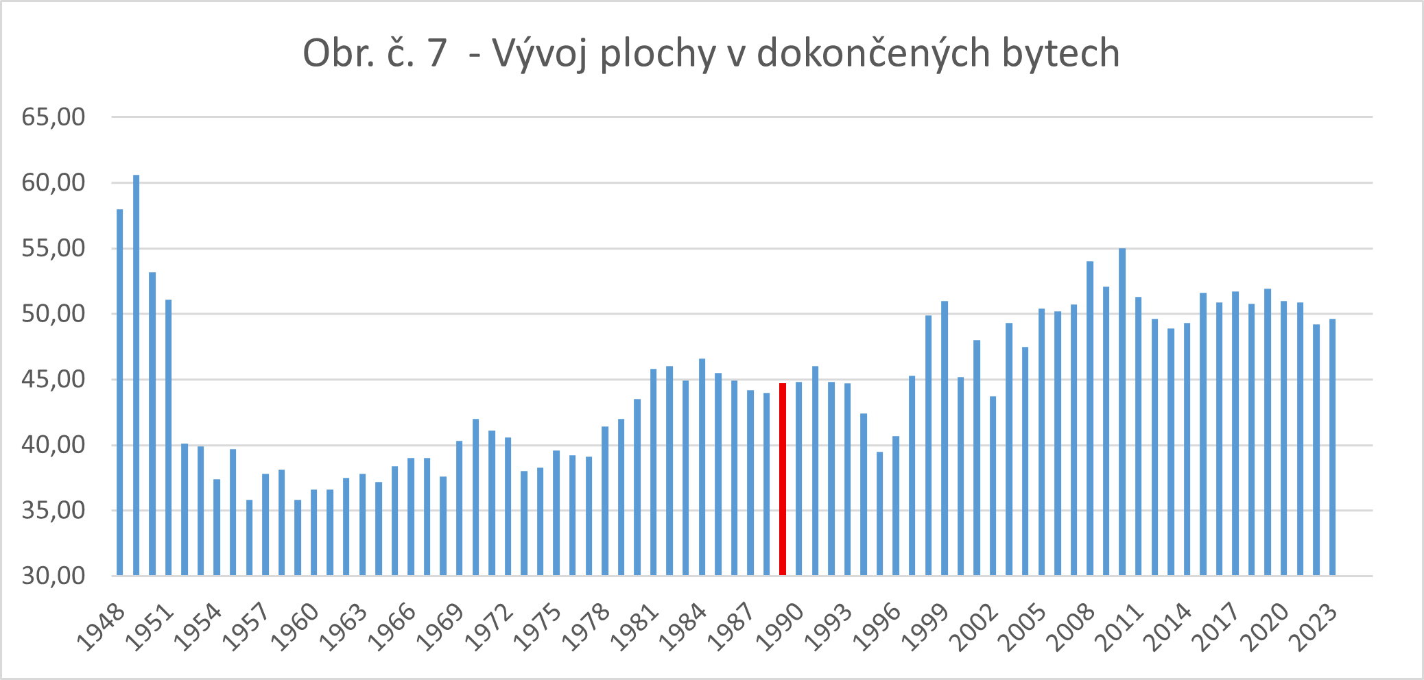 Pokud vezmeme v úvahu vývoj plochy bytu do roku 1989, plánovači národního hospodářství brali v úvahu potřebu uspokojit co největší počet obyvatel a také růst počtu narozených dětí v rodinách. K růstu velikosti bytů proto docházelo velice pozvolna. Výstavba bytů byla limitována výrobními kapacitami, například dostatkem cementu pro výrobu panelů jakožto důležitého prvku panelových bytů. Kromě bytů spotřebovalo obrovské množství cementu i budování dálnice D1, výstavba úkrytů pro letadla, podzemních krytů na letištích nebo palebných postavení protiletadlových raket.