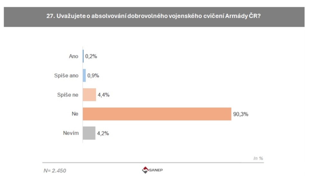 Tento graf dává, bohužel, za pravdu těm, kteří si myslí, že aktivních obránců vlasti by nebylo příliš mnoho. Vidíme, že dobrovolných zájemců o jistou formu vojenského výcviku, je velmi málo.