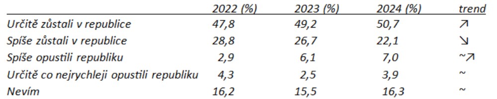 Při pohledu na odpovědi vidíme, že polovina lidí (50,7 %) má pevný názor a chtěla by určitě zůstat v republice. Také jsem rád, že od dubna 2022 se jejich počet o cca 3 procentní body zvýšil. Sice neznáme jejich přesné pohnutky, ale chci věřit, že v některých z nás probudil konflikt na východě Evropy a s ním spojené dění jakési vlastenecké cítění.